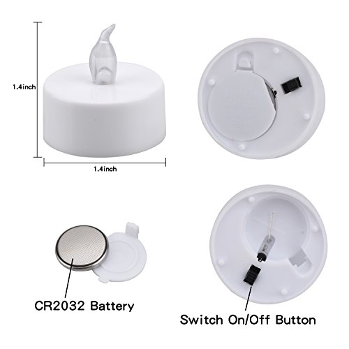 -. Feature : 125-Pack/MULTITUDE OF USES - The flameless candles 125-Pack(1.4"×1.4") can be used anywhere to achieve a persistent and atmospheric ambience. For example, put them into votive holders and place them on dining tables or on the windowsill for a romantic hearty dinner or Valentines. Besides, they can be used in restaurants as safe and hazard-free flickering candle light on each table! / EASY TO USE - A generous pack of 125-Pack tea light candles come with batteries which can be replaced easily via the tab at the bottom. On/Off switch for convenient operation at the bottom of the candle! / LONG BATTERY LIFE - These battery operated LED candle lights are made of PP, with CR2032 batteries included, which can last 100H+ light-time. The amber yellow 125-Pack tea light are BEST CHOICE for WEDDING OR GIFT! / NO FLAMES, NO FUMES, NO FUSS - These LED Candle Lights can be used without having to worry of flame, absolutely no fire hazards or burning risks. These realistic candles will flicker away for hours with no heat generated. Totally safe around children, pets & home furnishings! / 100% SATISFACTION GUARANTEE - All the flameless wave open tea lights are thoroughly and rigorously tested and sold exclusively by Eloer. If you have any problem please feel free to contact us. We will offer you satisfactory !