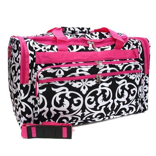 -. Binding : Apparel -. Brand : LD Bags -. ClothingSize : 22 X 13 X 11 -. Color : Black/White/Hot Pink -. Department : womens -. Feature : 22 X 13 X 11 / Convenient handles and carry strap / 2 Front Zippered Pockets / 2 End Bag Zipper Compartments / Feet on the Bottom of Bag -. Model : DDMKBLKHPT22YH -. ProductGroup : Apparel -. ProductTypeName : LAGE -. Size : 22 X 13 X 11 -. Title : LD Bags Womens Black/White Damask w/Hot Pink Trim, 22"