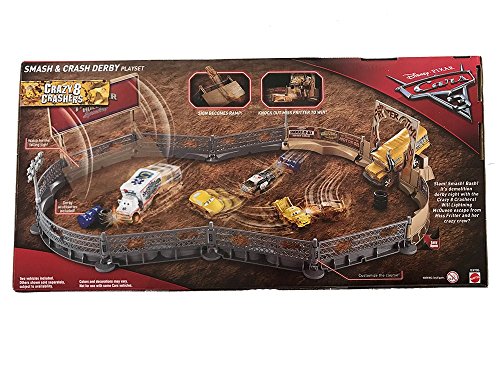-. Binding : Toy -. Brand : Disney -. EAN : 0887961406924 -. Feature : Playset modeled after the Crazy 8 derby race from Cars 3 / Rev up your racers and watch them speed and bash around. Crash into derby champion Miss Fritter until she is knocked down! / The arena can be reconfigured, for 3 exciting courses / Includes barrels, tires, and other themed obstacle accessories / Comes with mud covered 1:55 scale Lightning McQueen -. IsAdultProduct : 0 -. Label : Mattel -. Manufacturer : Mattel -. Model : DXY95 -. MPN : DXY95 -. PackageQuantity : 1 -. PartNumber : DXY95 -. ProductGroup : Toy -. ProductTypeName : TOYS_AND_GAMES -. Publisher : Mattel -. Size : n.a. -. Studio : Mattel -. Title : Disney Pixar Cars 3 Crazy 8 Crashers Smash & Crash Derby Playset -. UPC : 887961406924 -. Warranty : 1 year warranty against manufacturer defects