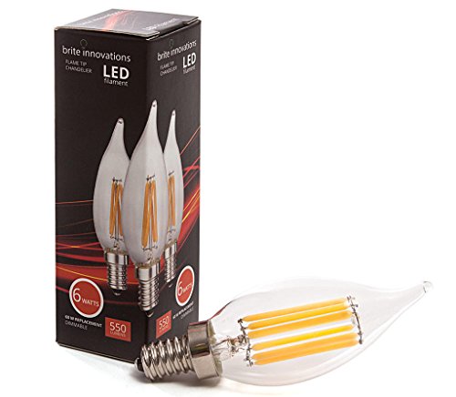 Brite Innovations (3 Pack) Energy Saving 5-Watt LED Filament Candelabra Light Bulb-Dimmable-Soft White 3000K-Flame Tip-Exact Equivalent Standard 60W Incandescent Bulb UL-Listed