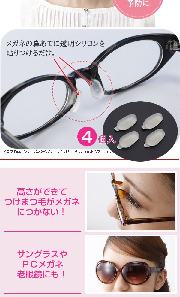 | 眼鏡に貼るだけ!眼鏡のずれ落ちや色素沈着によるメガネ跡、つけまつ毛がレンズにあたるなどの不満を解消してくれるアイテムです。柔らかい素材のシリコンだから顔にフィット。眼鏡をかけたときのストレスを軽減してくれます。これであなたもモテガール! |