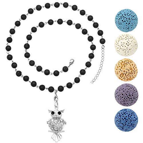 Top Plaza Aromatherapy Essential Oil Diffuser Natural Lava Stone Bracelet Necklace Openable Hollow Silver Locket Pendant W/5 Dyed Lava Stone(Owl)