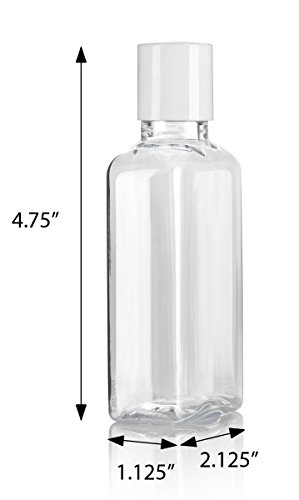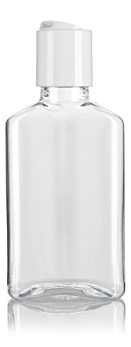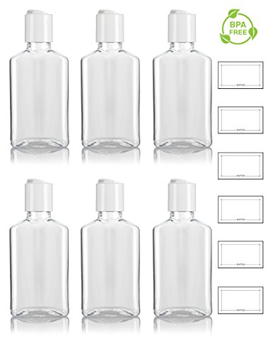 3.4 oz / 100 ml Clear PET (BPA Free) Plastic Oblong Flask Style Refillable Bottle with White Disc Cap Tops (6 pack) + Labels