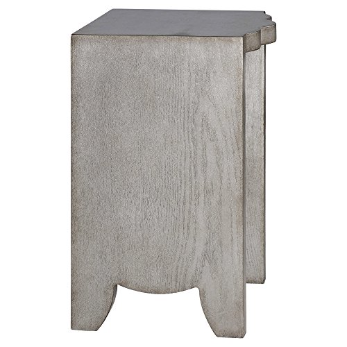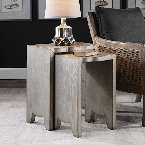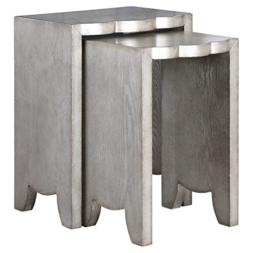 -. Brand : Kathy Kuo Home -. Color : Silver -. Feature : Small: 22 inches high x 14 inches wide x 14 inches deep; Large: 24 inches high x 18 inches wide x 14 inches deep / Constructed from wood / Burnished silver finish that highlights the wood grain / Weight: 37 pounds / Sold as a pair -. Label : Kathy Kuo Home -. Manufacturer : Kathy Kuo Home -. MPN : UTM-24733 -. PartNumber : UTM-24733 -. ProductGroup : Furniture -. ProductTypeName : HOME_FURNITURE_AND_DECOR -. Publisher : Kathy Kuo Home -. Studio : Kathy Kuo Home -. Title : Dali Regency Rustic Silver Scallop Nesting Tables - Pair