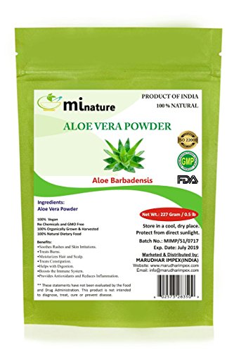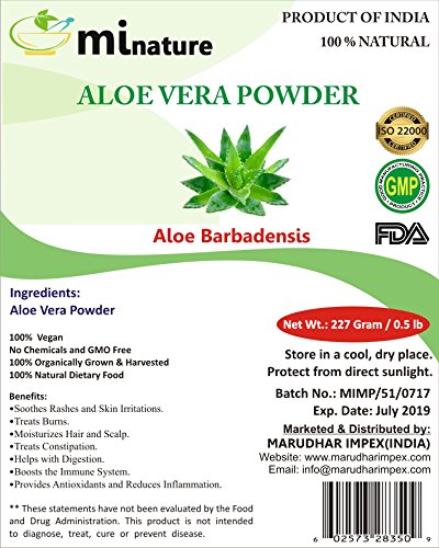 -. Feature : 100% Pure and Natural Organically Grown Aloe Vera Powder made from Dried Leaves of Aloe Vera Plant / Aloe Vera is most widely used herb used as a cosmetic across the world. Our Aloe Vera Powder is 100% Natural and comes with no contamination. It is made by griding the dried Aloe Vera Leaves in Proper mesh. It can be used directly as well by blending with other herbs in cosmetic and herbal practices and formulations. adds moisture and conditions the hair, nourishes new growth, soothes and heals an irritated scalp, helps stimulate growth, balances pH of the scalp. / Cosmetic Grade. Conditions hair and skin & Ideal for skin inflammations / "mi nature" is committed to producing the highest quality products and Natural Herbs that are sustainably sourced and fairly traded. All our products are 100% natural and processed in FDA Registered Facility in India. ""mi nature"" products bring you closer to nature & mother earth. We believe in creating for our customer by making them healthier. Our processors take care that each and every products is processed in the purest form and packed hygienically. To help you get the best utility. / 1/2 LB (227 grams) Resealable Reusable Zip Lock Bag