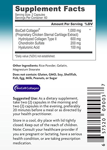 -. Feature : 2 bottles of 120 Capsules / BioCell Collagen is the award winning and patented skin & joint supplement proven to work in multiple human clinical trials. BioCell Collagen contains a natural synergy of hydrolyzed collagen type II, chondroitin sulfate, and hyaluronic acid in matrix form that cannot be found in any other supplement / Clinically shown to reduce joint stiffness and discomfort. Promotes joint lubrication and mobility. Promotes cartilage, tendon, ligament, and connective tissue health / Clinically shown to reduce fine lines and wrinkles, and reduce skin dryness by 76%. Clinically shown to increase skin collagen (type I & III) and blood microcirculation in the face / Made in the USA in a GMP-certified facility. Winner of Better Nutrition's 2014 Best of Supplements Award. Winner of Frost & Sullivan's Best Joint Health Ingredient Award, Since 1997, millions of people around the world have experienced the benefits of BioCell Collagen. Backed by clinical trials, BioCell Collagen has been shown to help the body maintain healthy connective tissues, flexible joints, and younger looking skin. It contains a patented composition of hydrolyzed collagen type II, chondroitin sulfate, and hyaluronic acid in a naturally-occurring matrix form that cannot be found in any other supplement. Multiple human clinical studies have validated BioCell Collagen's safety, efficacy, and rapid absorption into the body. In addition, a recent study presented at the 2014 International Society of Sports Nutrition Conference demonstrated that BioCell Collagen aids in the protection and recovery of musculoskeletal tissue during sports activity, making it a highly effective performance recovery supplement
