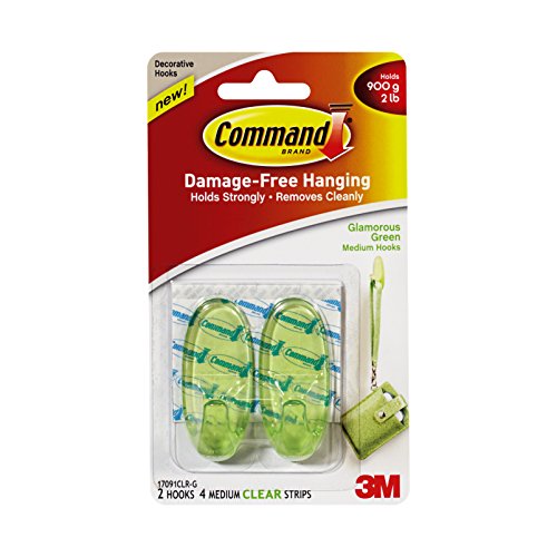 Command 17091CLR-G Glamorous Green Hooks 2 Medium Hooks, 4 Clear Strips/Pack
