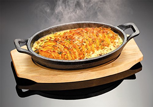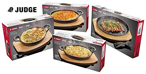 Studio : Judge Publisher : Judge Product Description -Durable Cast Iron Oven to Table Dish plus Heat Resistant Maple Wood Serving Stand. - Cast Iron retains the heat while serving - keeps food hotter for longer. - Suitable for all hob types BBQ's - oven safe to 240 degC / 464 degF - Approx Size; 20 x 14cm / 8 x 5.5". 0