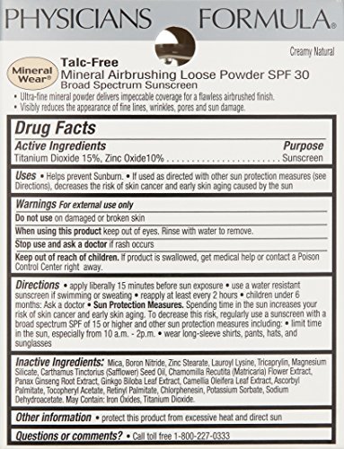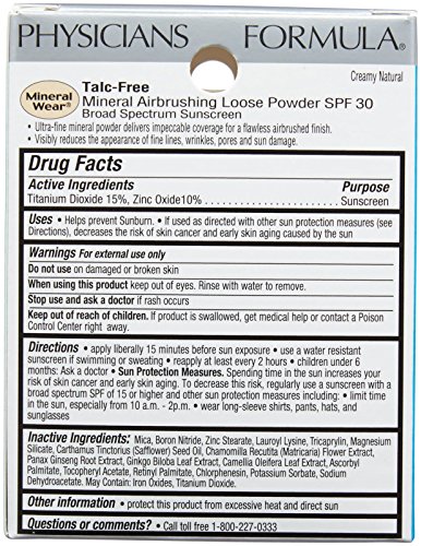 ReleaseDate : 2014-09-01 Studio : Physicians Formula Publisher : Physicians Formula Binding : Health and Beauty Product Description Ultra-fine mineral powder delivers impeccable coverage for a flawless airbrushed finish, visibly reducing the appearance of fine lines, wrinkles, pores and sun damage. Formulated with soothing plant extracts, protective antioxidants, nourishing Vitamins C and E and SPF 30, the result is a visibly firm, smooth, healthy and youthful complexion. The gentle, talc-free, minimalist formula allows skin to breathe and can help minimize the risk of irritation and breakout. The powder comes with a buffing kabuki brush for a smooth, skin-perfecting finish. The ultra-dense, flat shape provides a completely uniform and even application of loose powder. 0