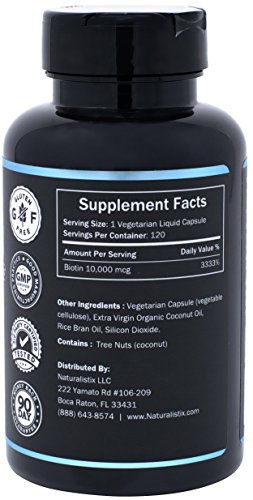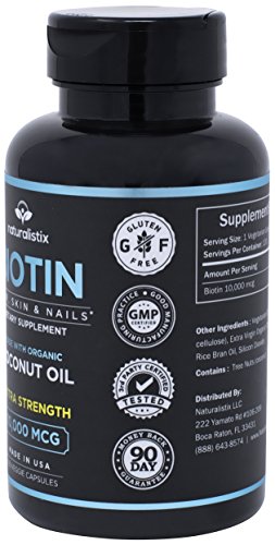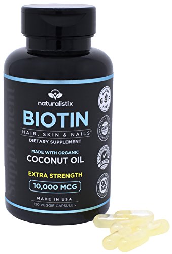 MAXIMUM STRENGTH BIOTIN FORMULA WITH COLD PRESSED ORGANIC COCONUT OIL: This is a 10000 MCG Maximum strength biotin capsules from Naturalistix that is designed for maximum hair, skin and nail growth. Give your body a boost of b7 daily and keep your hair, skin and nails growing and glowing. Cold pressed organic coconut oil is added for maximum absorption. 120 capsules per bottles.