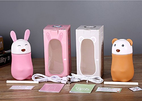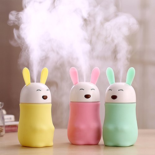 - Lovely Small Rabbit Humidifiers--Unique Cute Design,made of high quality ABS,PP and Silicone.quietly moistens the air in small spaces,Providing the ideal moisture balance to help your breathe better.with 180ml water tank it gives 5 hours of continuous mist function.perfect to remove Static/Dust.It comes with an auto shut-off option after 5 hours(continuous mist mode)or waterless