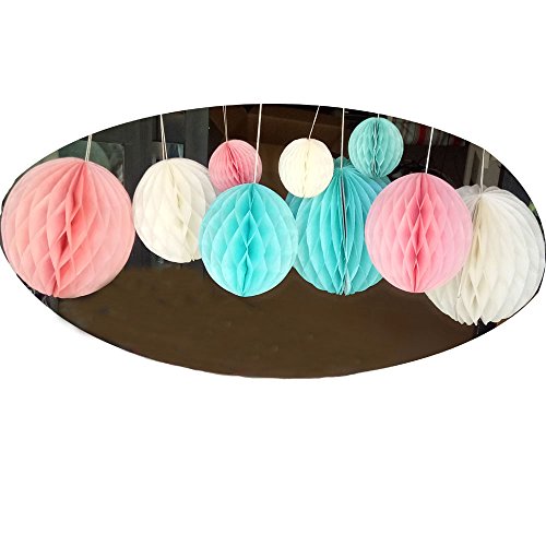 - The Package contains 9pcs pom poms balls in 3 size and 3 color: 3 inch(1pcs mint + 1pcs cream + 1pcs peach), 6 inch(1pcs mint + 1pcs cream + 1pcs peach), 8 inch(1pcs mint + 1pcs cream + 1pcs peach) ; material: DIY tissue paper, handmade honeycomb tissue balls, hanging decoration balls