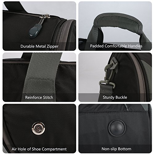 -. Feature : Waterproof polyester fabric, rip stop nylon lining and non-rusting red hardware. / DIMENSION: 17.5" x 10.6" x 10.6"/ 44cmx27cmx27cm (LxHxW). / KEEP THINGS ORGANIZED, Separate compartments for holding clothing, towel, toiletries, shoes EVEN WET ITEMS!!! / Removable fully adjustable padded shoulder strap and velcro close handles, Quick access side mesh pocket, reinforced seam construction. / Perfect for use as a lightweight gym bag, gym sack, shoe bag, sports bag, travel bag, duffel bag, carry bag, airline bag to carry all your gears.