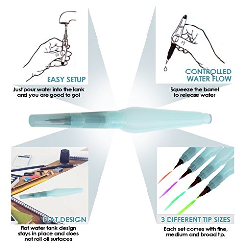 - 6 Pack Water Brush Pen Set: This art markers includes 2 bold, 2 medium, and 2 small tips self-moistening, portable water brush pens. This water brush assorted tips is a great choice for artists of every experience level.Come and try this paint pens.Perfect water brush pen for watercolor painting & lettering!