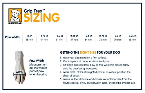 -. Feature : The Ruffwear Grip Trex dog boots set the standard in paw wear for dogs who hike, bike, run, or explore the great outdoors with their humans. / These high-performance boots feature a rugged and resilient Ruffwear-designed Vibram outsole that provides exceptional traction on varied terrain. / Breathable mesh upper provides ventilation and keeps dirt and debris out. Closure system combines hook-and-loop with hardware, cinching around the narrowest part of the dog's leg to provide a secure fit. / SIZING 1.5 in (38 cm) 1.75 in (44 mm) 2.0 in (51 mm) 2.25 in (57 mm) 2.5 in (64 mm) 2.75 in (70 mm) 3.00 in (76 mm) 3.25 in (83 mm)