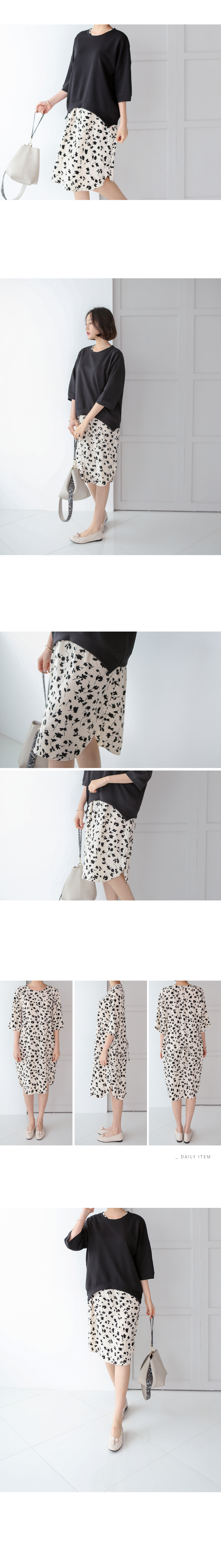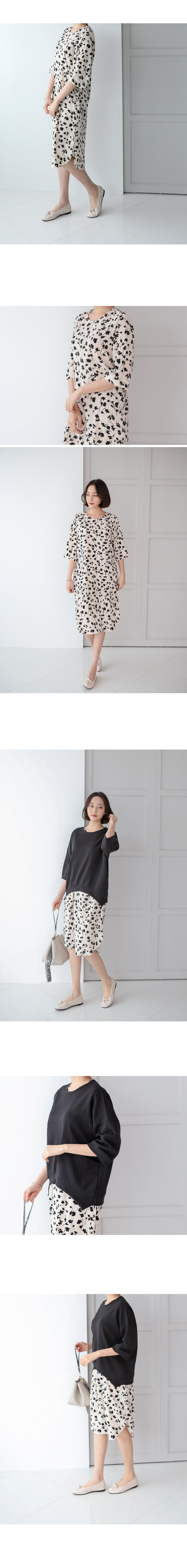 단정한 라운드넥에 8부길이의 소매와 둥글게 떨어지는 밑단으로