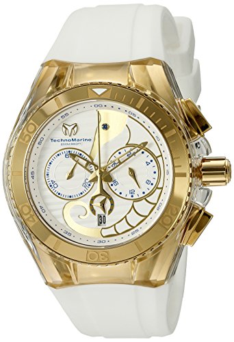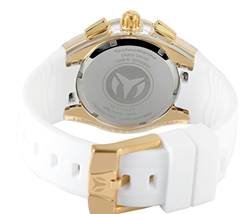 -. Binding : Watch -. Brand : TechnoMarine -. Color : White/Gold -. Department : womens -. EAN : 0886678978564 -. Feature : Chronograph Functions with 60 Second, 60 Minute and 24 Hour Sub dials; Date Window at 6:00; Set Includes: White Silicone Case Cover & White Satin Strap; Unidirectional Gold Tone IP Stainless Bezel / Silver Dial with Gold Tone Seahorse Design, Gold Tone Hands & Blue Arabic Numerals; Luminous; Gold Tone IP SS Case with Clear Silicone Cover; White Silicone Strap; Screw-Down Crown; Mineral Crystal / Quartz Movement / Case Diameter: 40mm / Water Resistant 200m (660ft): in General, Suitable for Professional Marine Activity and Serious Surface Water Sports, but not Diving -. Label : Swiss Watch International -. Manufacturer : Swiss Watch International -. Model : TM-115003 -. MPN : TM-115003 -. PackageQuantity : 1 -. PartNumber : TM-115003 -. ProductGroup : Watch -. ProductTypeName : WATCH -. Publisher : Swiss Watch International -. Studio : Swiss Watch International -. Title : Technomarine Women's 'Cruise Dream' Quartz Stainless Steel Casual Watch (Model: TM-115003) -. UPC : 886678978564