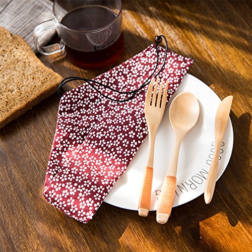 TAMUME Wooden Flatware Mixed Cutlery Sets Portable for Travel with Travel Pouch of 3 Piece Wooden Tableware Kitchen Utensils Including Wooden Spoon, Wooden Fork and Wooden Butter Knife (Red West)