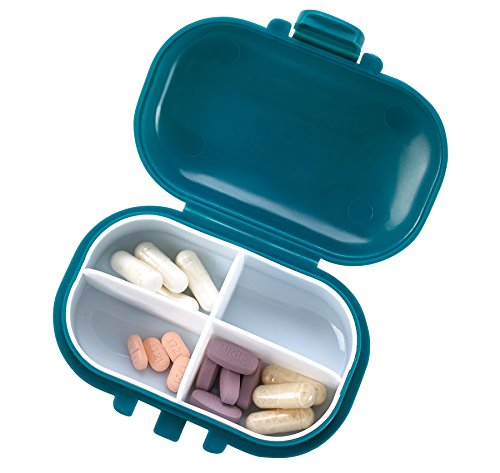 The innovative rounded space-saving design fits easily into purses, overnight bags, luggage or perfect for use in your own home. No need to use a pill splitter when your pills easily fit into the oversized compartment. Features Benefits: - Fits Approx. 25 Pills and/or Vitamins