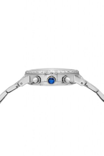 - Swarovski crystals detailed case, bezel and dial; Blue Swarovski crystal on crown; Blue double layer dial with date window between 4 and 5 o'clock; chronograph subdials at 3, 6 and 9 o'clock