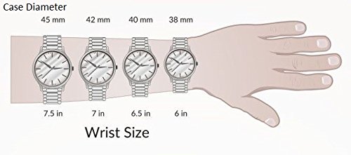 - 36 mm case diameter; 9 mm case thickness; Silver tone stainless steel case and bracelet; Bracelet is adjustable, extra links can be removed by any jeweler