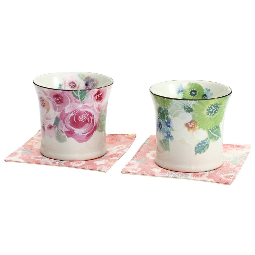 色鮮やかな花柄が美しいコースター付きカップのペアセットです。大切な方へのギフトにも最適です。 |