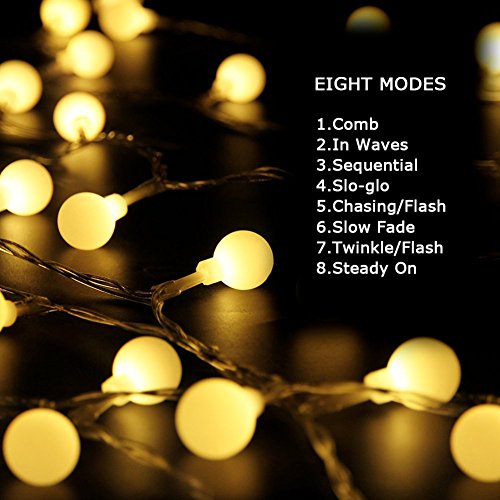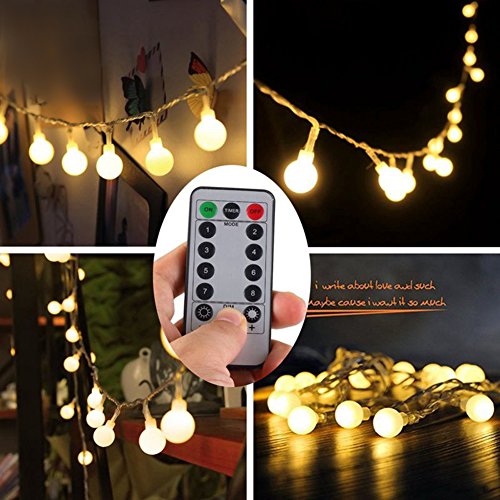 -. Feature : The Fairy Lights have 8 different light modes: Combination, In Waves, Sequential, Slo-glo, Chasing/Flash, Slow Fade, Twinkle/Flash, and Steady On. Different lighting effects are controlled by only one button. / Battery-powered, requires 3 AA batteries(Not included). Portable and safe. Perfect for use at Christmas, Easter, other celebration events or simply to give your home a novel warm inviting glow. / The string lights are waterproof to suit for indoor and outdoor decoration, but the battery box is not waterproof, please keep it away from the damp place. / Come with Remote Controller for convenient use to select different light Modes, Timing program setting and adjust the brightness of the lights. Memory Function . / Length of the string light is 10 meters with 100 LED create excellent illumination and a warm atmosphere, spreading light and cheer across a wide area.