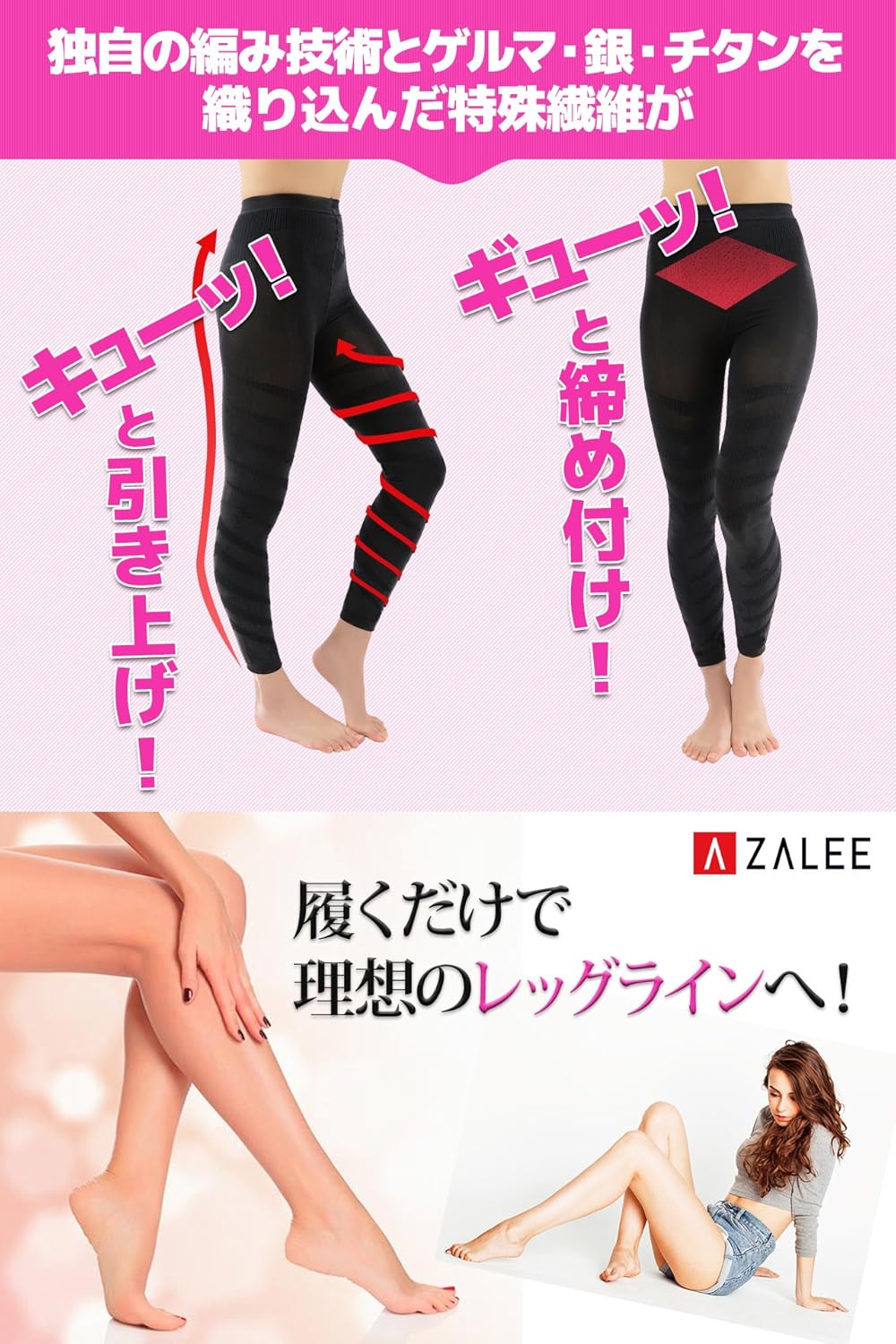 ゲルマニウム・銀・チタンを織り込んだ特殊繊維の着圧タイツで骨盤とリンパを強力サポート。
