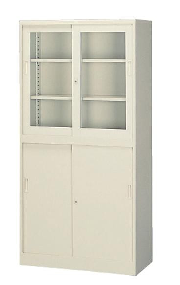 | ニューグレーカラーのガラス戸とスチール戸のコンビ引き違い書庫です。 |