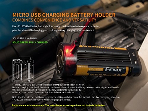 - CHARGE AT HOME OR IN THE FIELD - A rechargeable battery holder makes it easy to keep the TK35UE 2018's 2x 18650 batteries powered with a battery indicator to alerts you to low battery upon boot-up. Remove the battery holder from the flashlight and plug into an adapter, laptop, powerbank, laptop or other USB device!