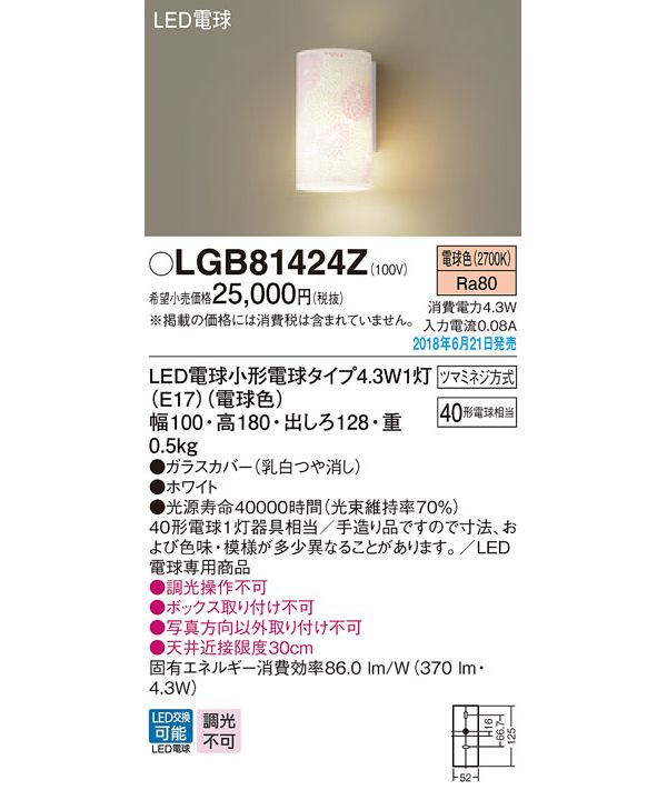 ●光源:LED電球小形電球タイプ4.3W1灯(E17)(電球色)、色温度:2700K、光源寿命40000時間(光束維持率70%)