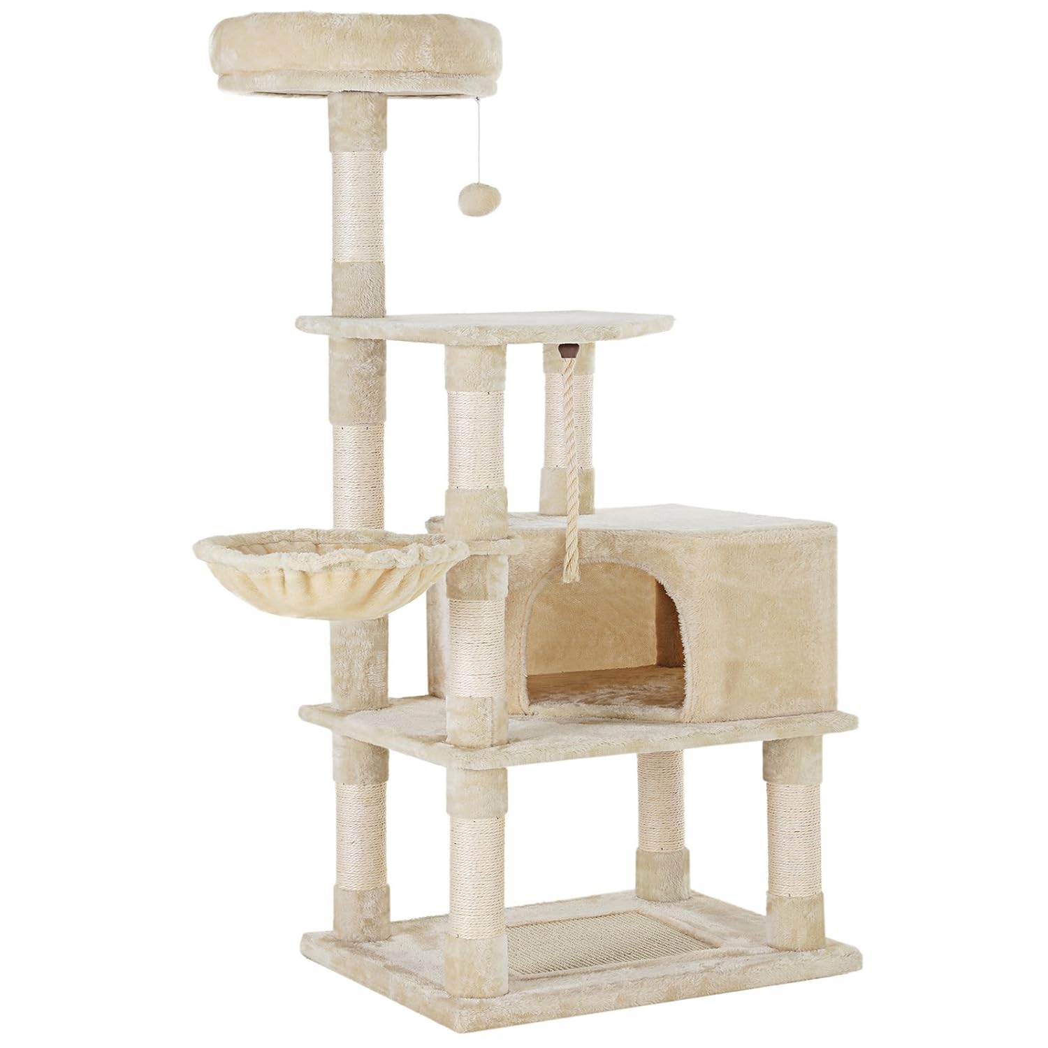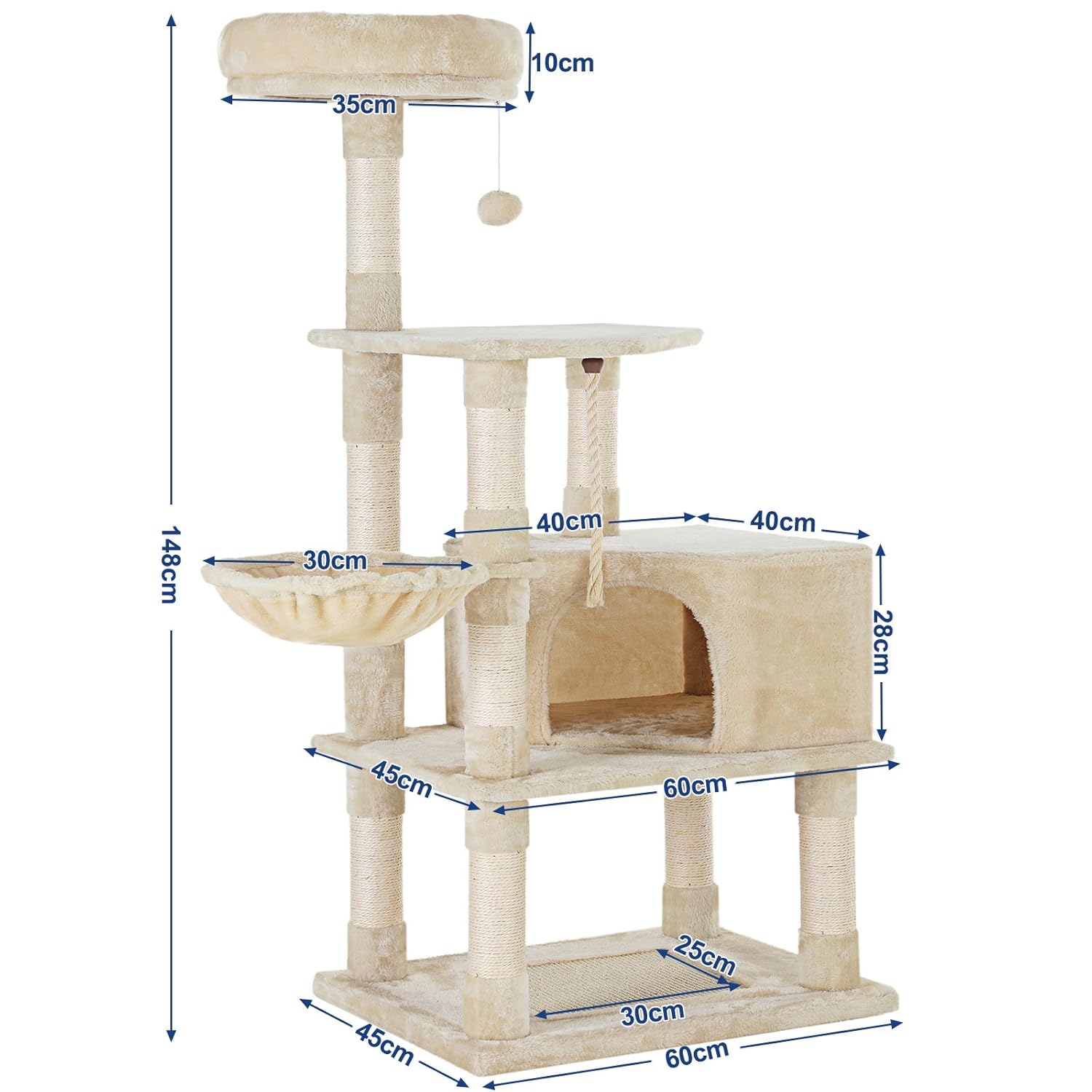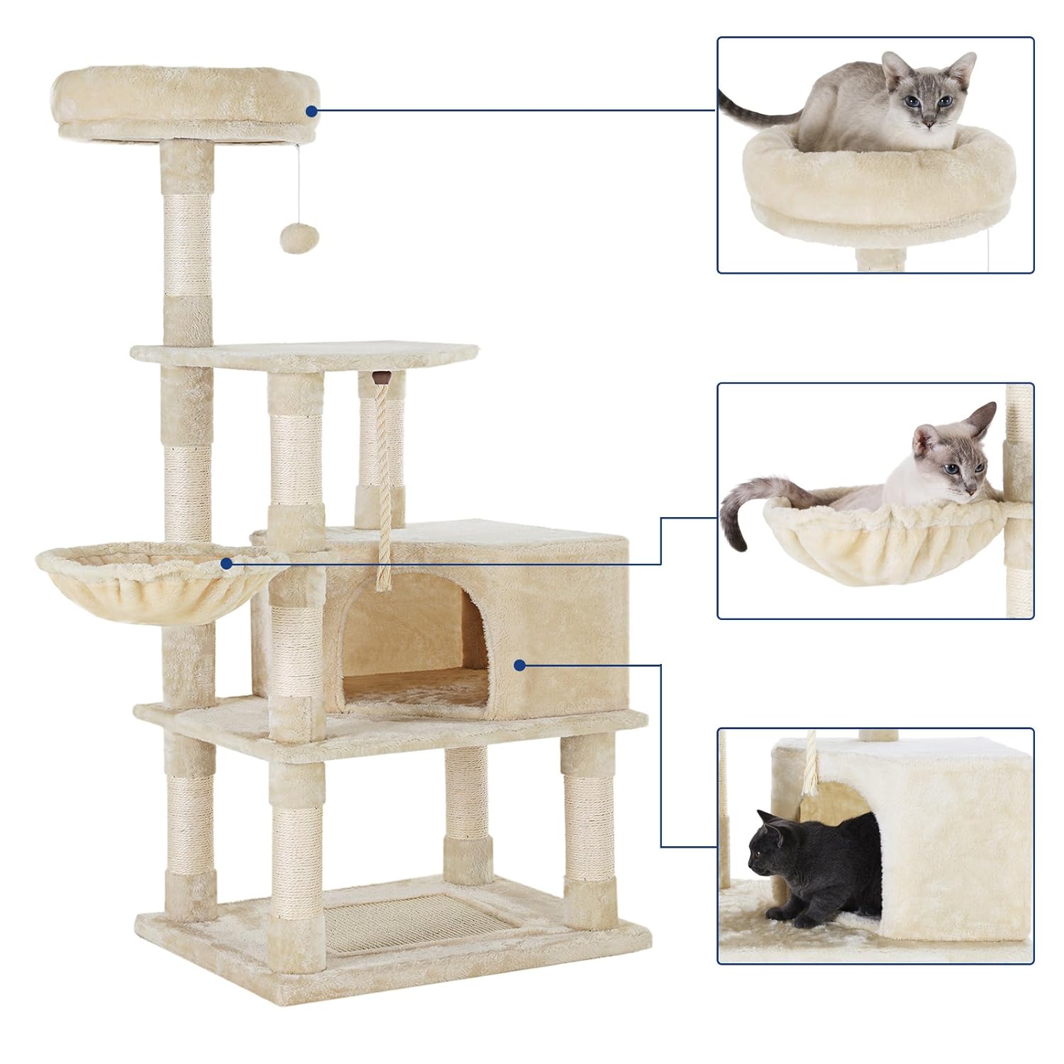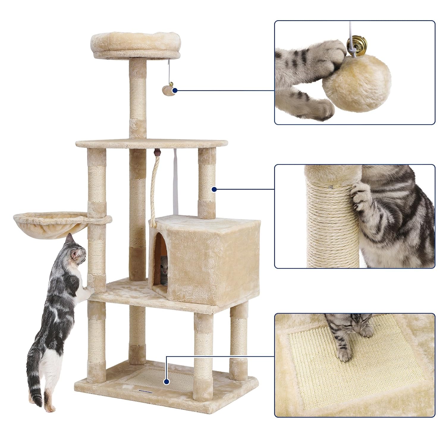 【猫が喜ぶ機能満載】見晴らしのよい高台、大きい隠れ家、10ヶ所以上の爪とぎポール、遊び放題の幅広い台座、猫パンチ用の吊り下げ、くつろげるハンモック、猫ちゃんの遊び場としてピッタリの室内用キャットランドです