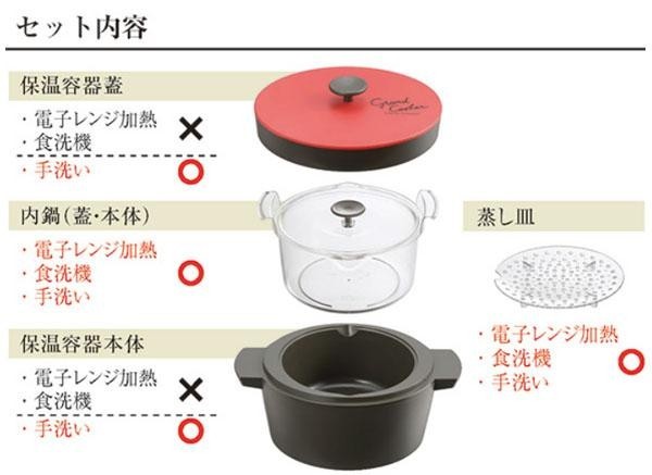 | 素材・材質 | 保温容器本体・保温容器蓋・保温容器ツマミ・内鍋ツマミ:ポリプロピレン 内鍋本体・内鍋蓋・蒸し皿:ポリメチルペンテン 溶着リング:ステンレススチール 断熱材:発泡スチロール |