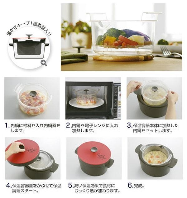 | レンジにかけた食材を保温容器に入れるだけ。火を使わずにじっくり本格保温調理☆ |