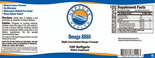 -. Binding : Health and Beauty -. Brand : Neptune Health Omega 8060 -. EAN : 0718122157624 -. Feature : Omega 8060 Fish Oil 120 gel caps/btl 2 Months Supply / Pharmaceutical Grade Fish Oil Third Party Tested - Mfg in white or blue bottles / Omega 3 Fish Oil No Aftertaste Natural Lemon Flavor / Moleculary Distilled for Purify Now in White bottles / Mercury Free PCB Free Highly concentrated Omega 3 formula -. IsAdultProduct : 0 -. Label : Neptune Health -. LegalDisclaimer : These statements have not been evaluated by the FDA. This product is not intended to diagnose, treat, cure or prevent disease. -. Manufacturer : Neptune Health -. NumberOfItems : 1 -. PackageQuantity : 1 -. ProductGroup : Health and Beauty -. ProductTypeName : HEALTH_PERSONAL_CARE -. Publisher : Neptune Health -. Size : 120 gelcaps -. Studio : Neptune Health -. Title : Omega 8060 1500mg 120 gelcaps Norwegian Fish Oil Pharmaceutical Grade Dietary Supplement Neptune Health -. UPC : 718122157624