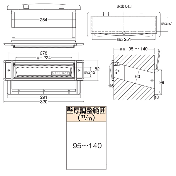 ●スペック:受口部:幅(mm)320 高さ(mm)82 取出し口開口寸法:幅(mm)251 高さ(mm)57 壁厚調整範囲95~140mm