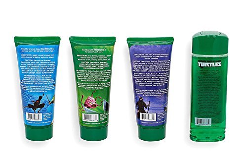 Teenage Mutant Ninja Turtles bathroom accessories & bubble bath set includes: Bubble Bath, 2-in-1 Shampoo and Conditioner, Body Wash and Hair Gel. This Shower set includes everything your little ninja needs to smell good and look SUPER FLY while they fight crime. Don't let your Little Ninja Turtle be the smelly kid in class and distract his peers from their studies with this Teenage Mutant Ninja Turtles Bubble Bath set