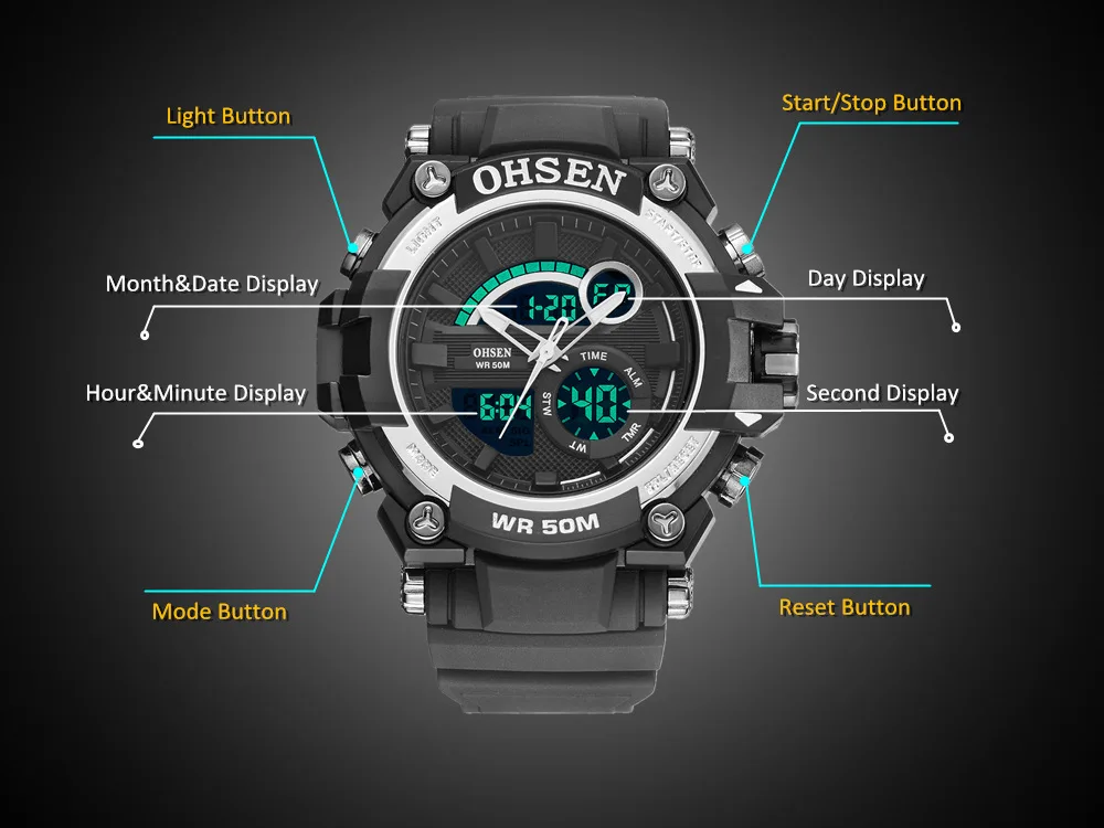 Feature:Back Light,Alarm,Water Resistant,Multiple Time Zone,Shock Resistant,Stop Watch,Complete Calendar,Auto Date,LED display