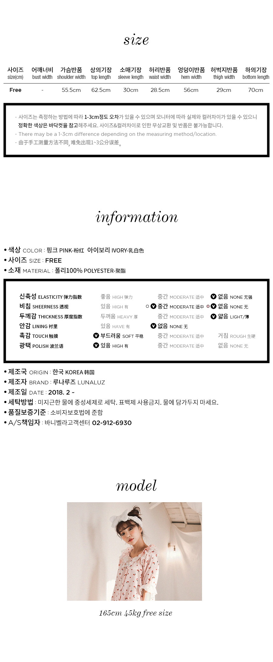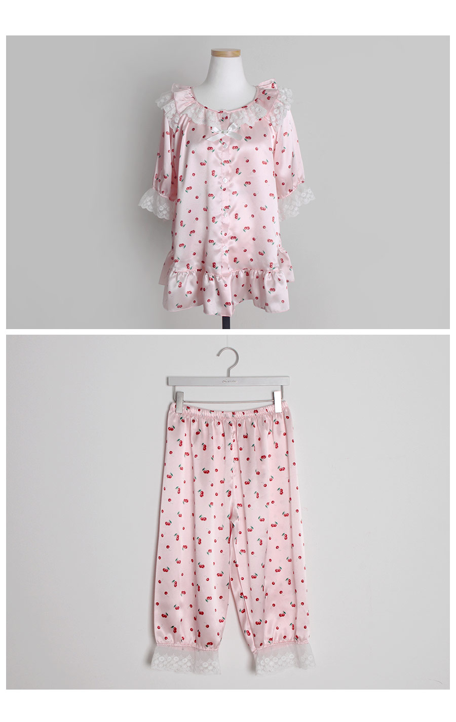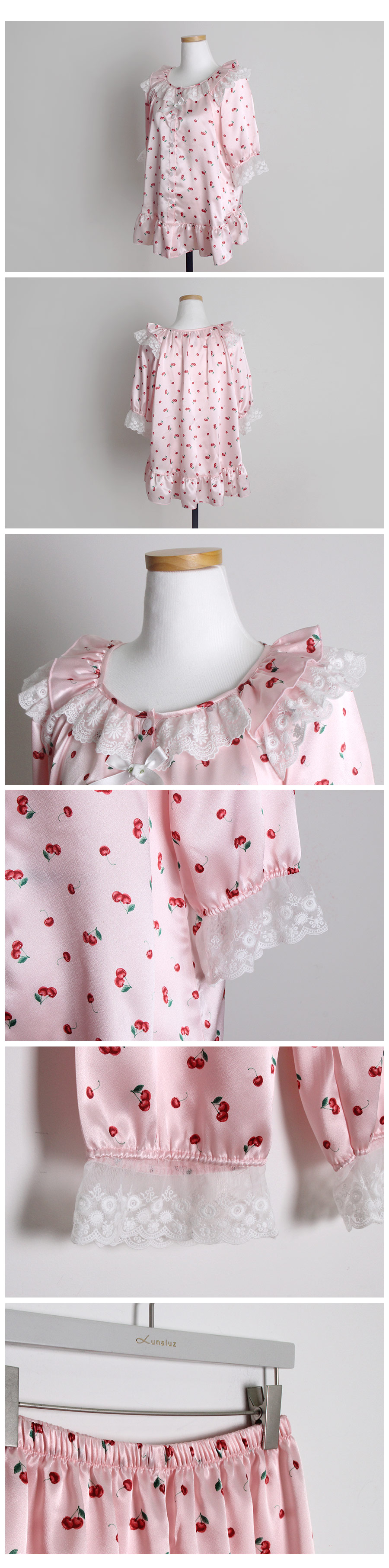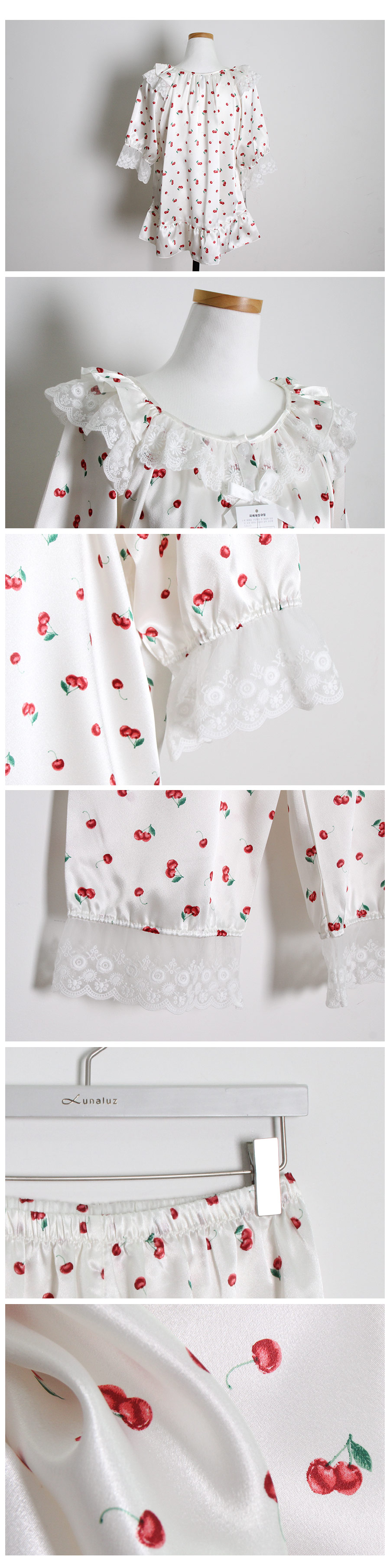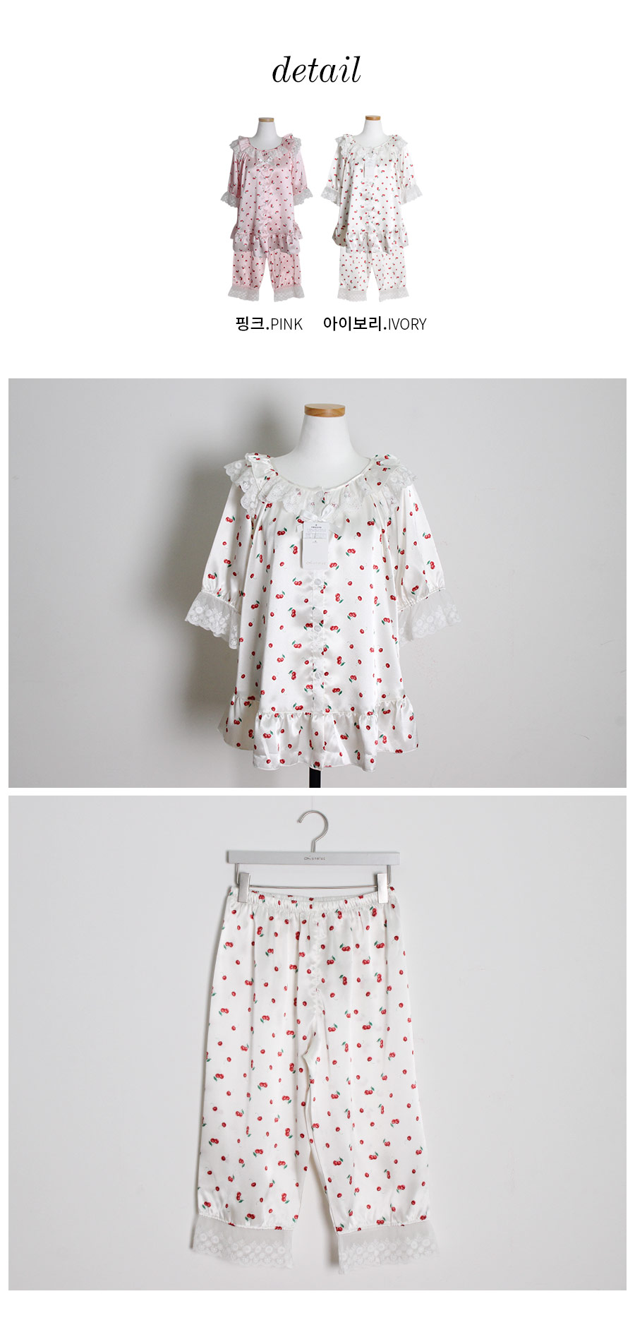 DETAIL 큐티한 체리 프린팅 샤무즈 원단과 러블리한 디자인이 조화롭게 제작된 슬립웨어에요~! 여성 잠옷은 편안한 라운드 스퀘어 스타일로 래글런 패턴을 응용해 떨어지는 실루엣이 여유 있고, 편안하며 여리한 느낌을 줍니다. 체형커버에 탁월한 패턴으로 슬림해 보이는 효과를 줍니다. 어깨선 없이 디자인된 잠옷으로 암홀의 절개선 없이 몸판과 소매가 이어지도록 디자인되었어요. 어깨선이 없이 매끄럽게 떨어지며 뒤에서 보았을 때에도 슬림하게 떨어지는 느낌을 받으실 거에요. 네크라인에 프릴 장식과 하늘거리는 망사 레이스 디테일을 봉제해서 포인트를 주었습니다. 전체 오픈형으로 탈착용이 용이합니다. 소매의 끝 단에는 살짝 밴딩을 넣어주고, 망사레이스 장식을 달아 포인트를 주었습니다. 팬츠는 7부 기장으로 더욱 러블리 하게 연출하실 수 있습니다. 남성 잠옷은 깔끔한 파자마셔츠 네크라인의 포켓 카라 스타일의 파자마 세트로 기본이지만, 패턴을 업그레이드 시켜 착용했을 때, 더 깔끔한 핏으로 연출하실 수 있습니다. 흐늘 거리는 소재인만큼 고난위도의 공정이 들어간 잠옷으로 소장가치가 높습니다. 100%국내 제작으로 원단, 디자인, 봉제의 퀄리티가 좋습니다.