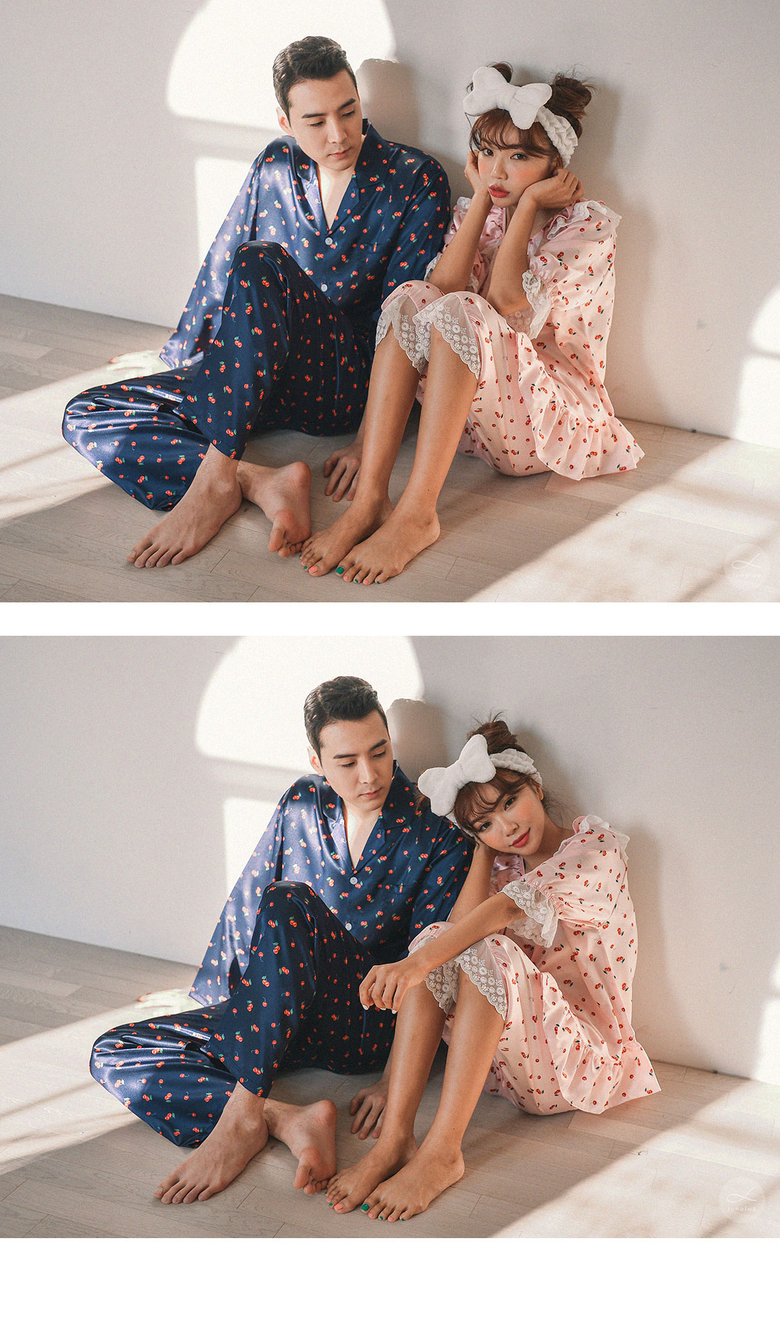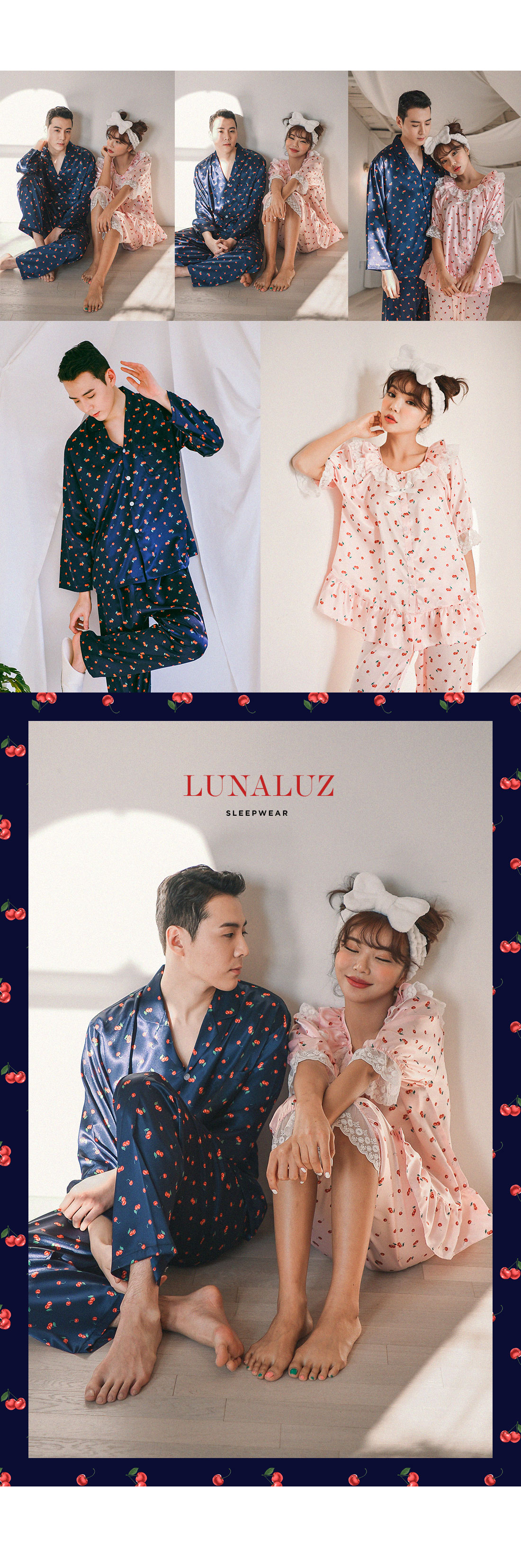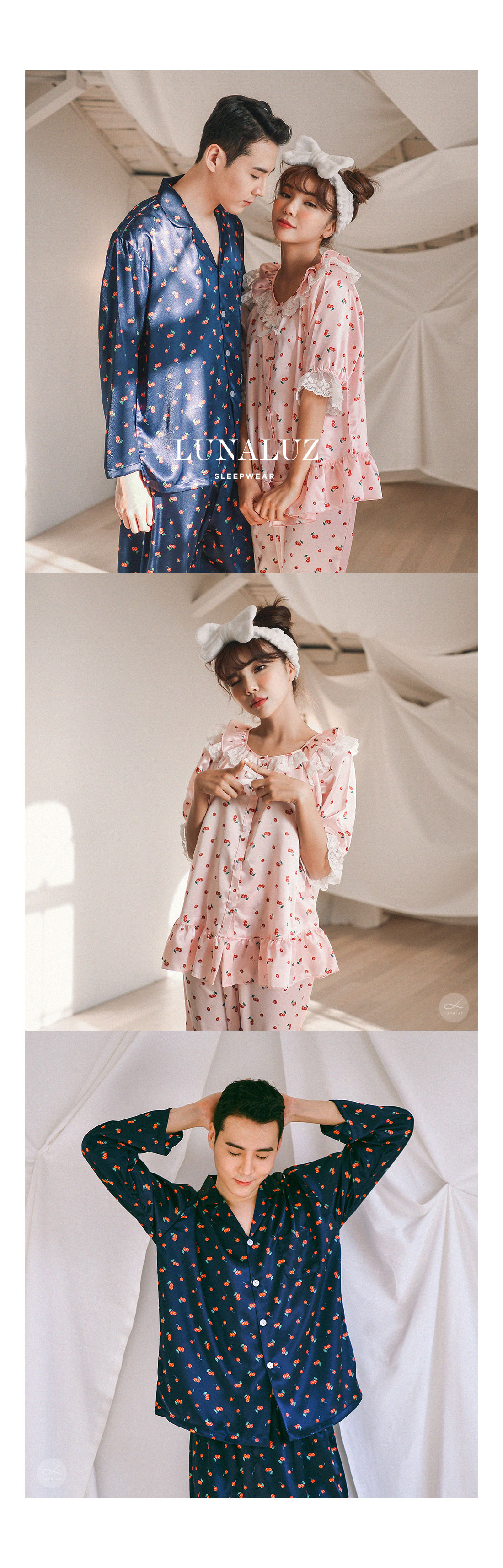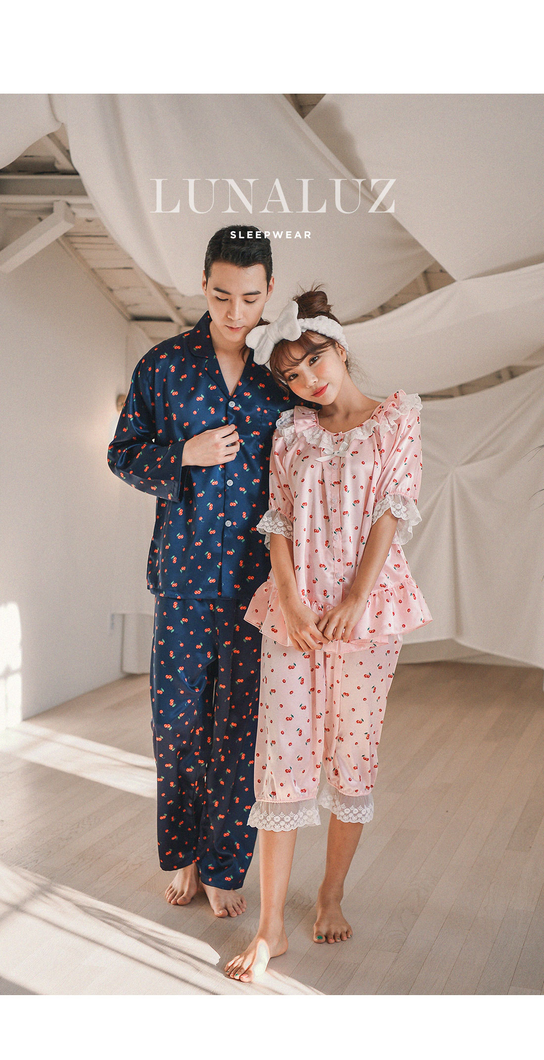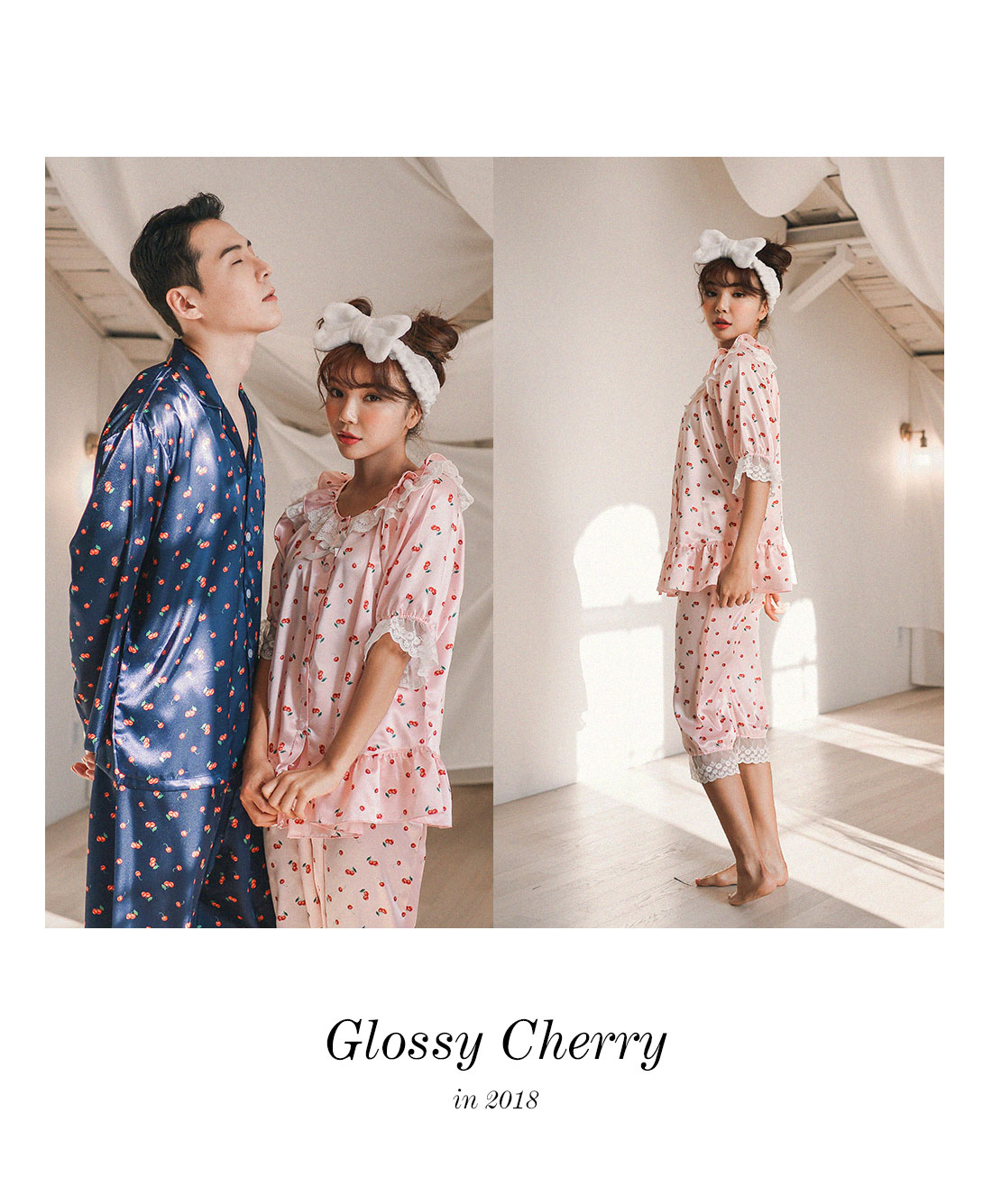 팬시한 체리패턴과 러블리한 컬러감이 매력적인 커플잠옷! 피부에 감기는 실키한 패브릭과 통통튀는 체리 프린팅이 세련된 무드를 내어주는 '글로시체리' 슬립웨어에요 :) 빛에 따라 감도는 글로시한 느낌이 매력적인 원단입니다. 직접 그린듯한 체리 프린팅은 일반 체리 프린팅보다 더 섬세하게 작업되었습니다. 여성 잠옷은 러블리한 핑크 컬러와 깨끗한 아이보리 컬러와 매칭되어 S/S 시즌에 화사하게 연출하실 수 있어요~! 남성 잠옷은 네이비 컬러 1가지로 구성했습니다.