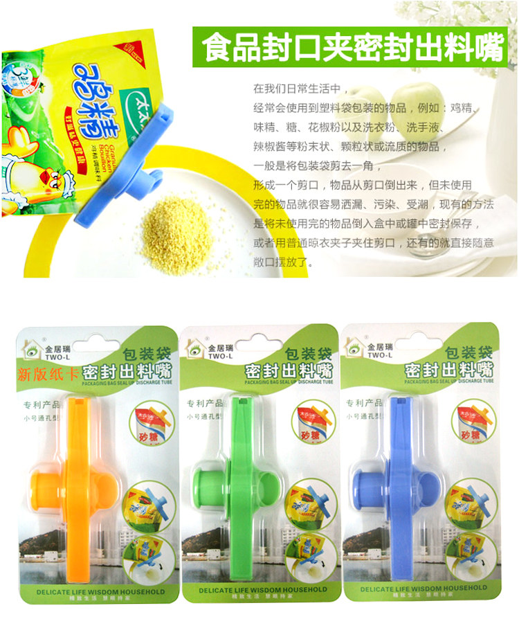 本产品是由密封夹和出料嘴组成适用于装有粉末或小颗粒状产品的包装袋,也可用在装有各种流质产品的包装袋上。