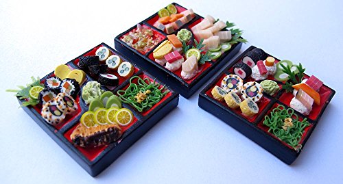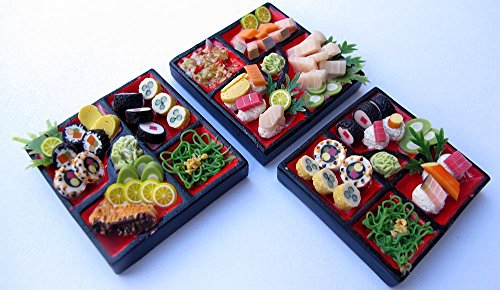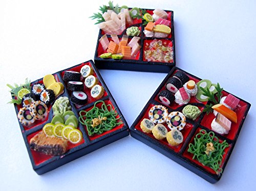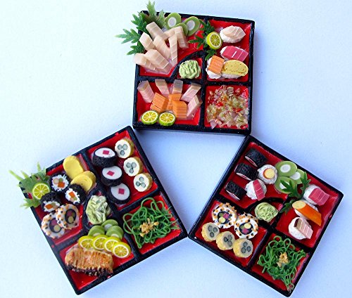-. Feature : 3 Assorted Sushi Bento Dollhouse Miniature Food / Made of High Quality Clay / Scale 1:6 / Product Of Thailand / Plates size 2X2 Inch's, Plates are made of Ceramic.