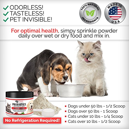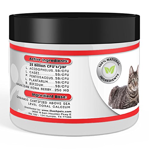 -. Feature : IMMUNE SYSTEM SUPPORT - With 25 Billion CFU's per jar, our Probiotics Plus for dogs and cats contains 5 pet-specific probiotic strains to strengthen & boost your pet's immune system. / IMPROVES DIGESTIVE HEALTH - Our advanced formula relieves diarrhea, loose stools, gas, irritable bowels & nausea as well as helps to improve & support overall digestion. / ANTIOXIDANT & ANTI-INFLAMMATORY - iDash Pets Probiotics Plus is enriched with Hawaiian Kona Berry, a powerful, nutrient rich antioxidant which naturally relieves pain caused by inflammation & helps to relieve skin allergies. / GUARANTEED BEST FORMULA - Our tasteless, odorless powder is pet-invisible and does not require refrigeration. We stand behind our probiotics with a 100% money back guarantee. / MADE IN USA - Our probiotic is made with all natural minerals & certified organic ingredients, manufactured in a GMP Certified and FDA Inspected Facility.