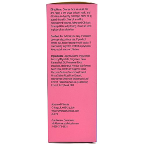-. Feature : PURE ROSEHIP OIL COMBINED WITH OTHER HIGHLY CONCENTRATED anti-aging ingredients such as Vitamin C, Pure Vitamin E, helps correct visible skin problems such as wrinkles redness, scarring, fine lines, age spots, dry skins. Cold pressed rosehip oil helps with dry and damaged hair and is great for brittle nails and cuticles. / PURE FORMULA WITH NATURAL INGREDIENTS- Antioxidant-rich blend instantly moisturizes and clarifies skin. Free from parabens and alcohol this oil is a great alternative to professional treatments. Rosehip oil works with any skin type and transforms your skin texture and tone for softer brighter skin. / INSTANT RESULTS- Face oil instantly replenishes moisture for smoother, softer skin. With daily use you will see increased hydration, improved radiance, more uniform skin tone. Within just 6 weeks you will see noticeable improvements with skin issues such as scarring, stretch marks, sun damage, fine lines and wrinkles. / MOISTURIZING AND EXTREME HYDRATION- Restore your skins youthful appearance with this top rated anti-aging face oil from Advanced Clinicals. Rosehip oil calms and hydrates any skin type (dry skin, oily skin, and sensitive skin) for a brighter complexion and improved elasticity. / TRUSTED FORMULA MADE IN THE USA IN FDA APPROVED LAB. NOT TESTED ON ANIMALS.