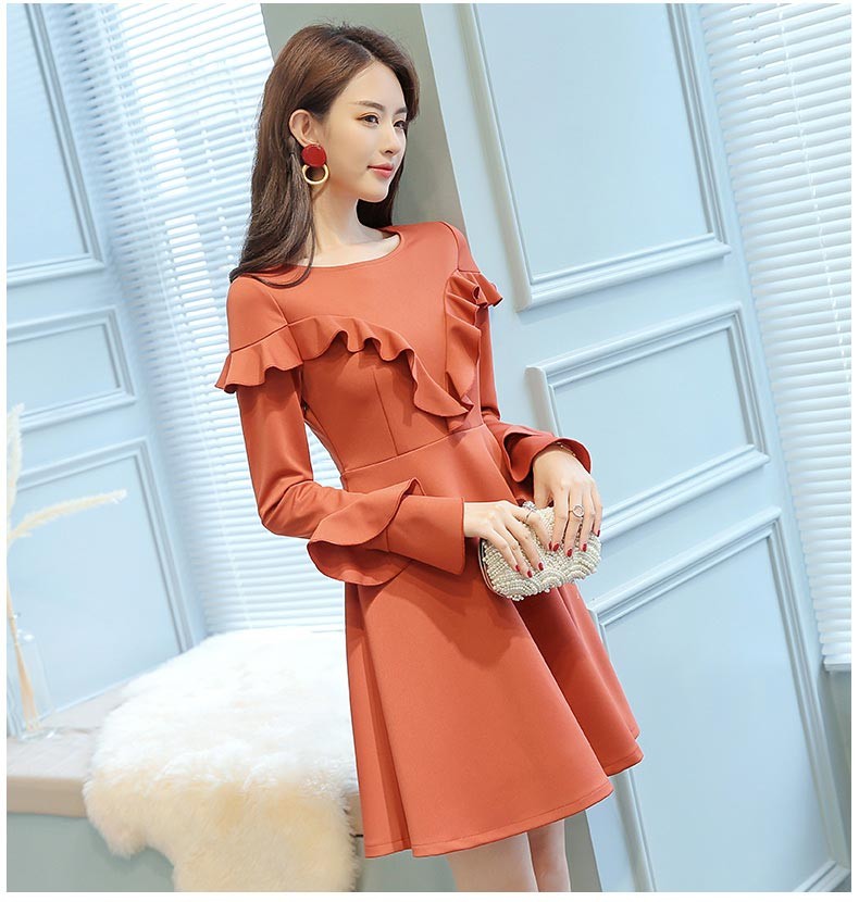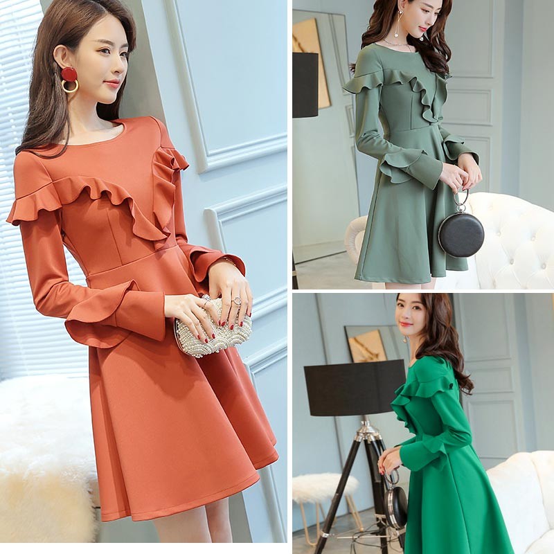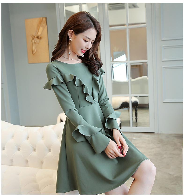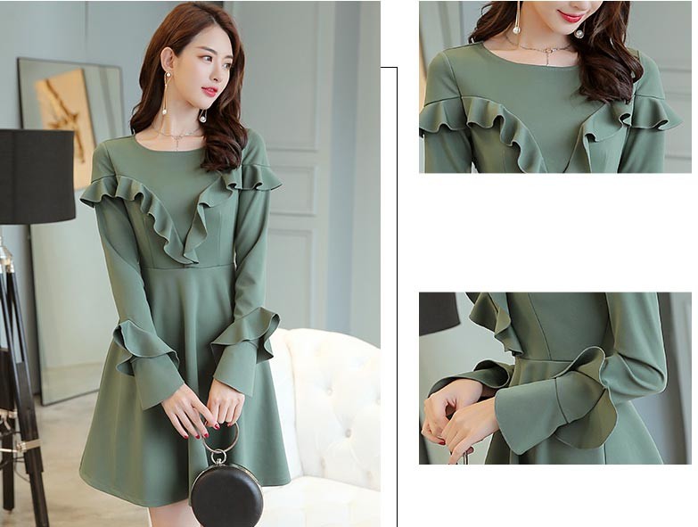 ラウンドネック・長袖・ひざ上丈・胸と袖にフリルデザインのワンピース♪