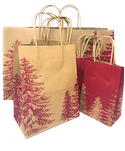Christmas Gift Bag Bundle - 12 Piece - Holiday Trees Design Kraft Bags (3 sizes