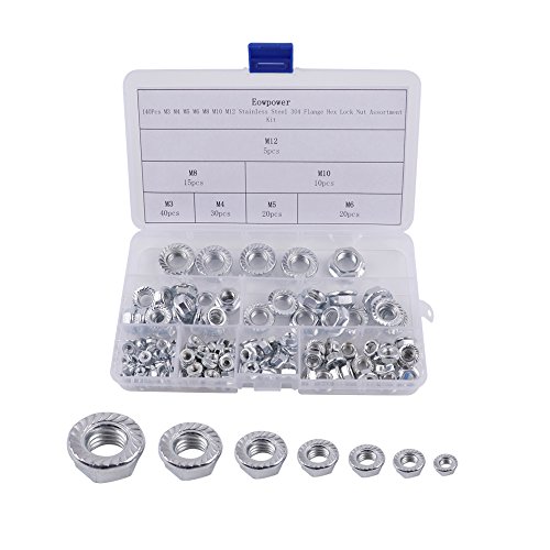 Eowpower 140Pcs M3 M4 M5 M6 M8 M10 M12 Stainless Steel 304 Flange Hex Lock Nut Assortment Kit