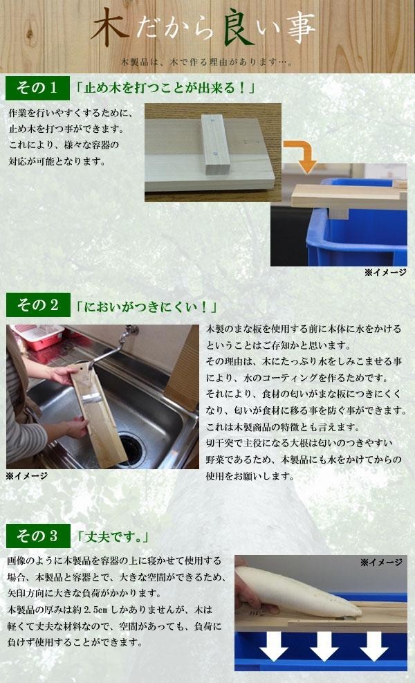 | 大根を突いて天日に干すだけ!!切干大根が簡単に調理できます。木でできているため軽量で丈夫。水をかけてから使用することで、においもつきにくくなります。40cmの深ザルに最適なサイズです。 |