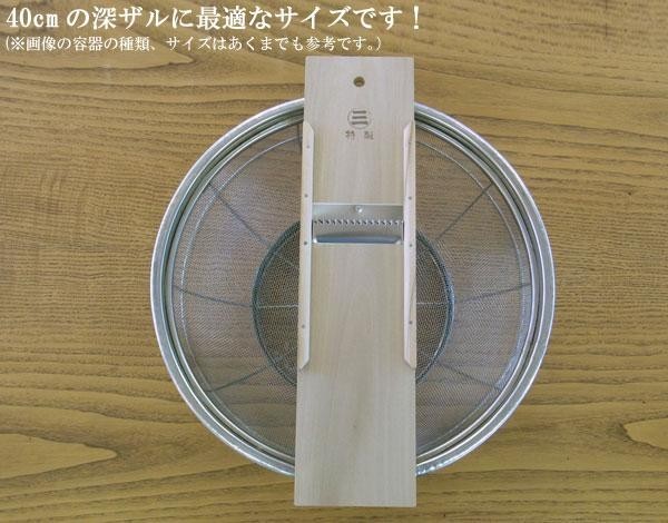 大根を突いて天日に干すだけ!!切干大根が簡単に調理できます。木でできているため軽量で丈夫。水をかけてから使用することで、においもつきにくくなります。40cmの深ザルに最適なサイズです。 |