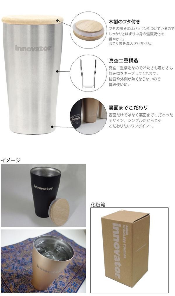 | イノベーターのシンプルなステンレスタンブラー。真空二重構造で保温・保冷効果が高く、飲み頃温度を長時間キープできます。お洒落な天然木の蓋にはパッキンが付いているのでこぼれにくい仕様です。 |